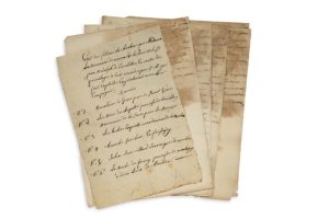 ROUSSEAU Jean-Jacques (1712 - 1778) 5 MANUSCRITS autographes ; sur 5 pages in-4 (larges brunissures ne nuisant pas à la lecture du texte, légères déchirures). Notes sur les femmes, en vue de l'ouvrage sur les femmes que Rousseau entreprit entre 1746 et 1750 pour sa protectrice Mme Louise DUPIN (1706 - 1799) et qui ne vit jamais le jour, d'après les tomes 3 et 5 de l'Histoire générale de l'Allemagne de Joseph BARRE (1748). Rousseau relève les passages relatifs au pouvoir politique des femmes :étendard magique des Normands tissé par la soeur du roi Héric ; défense héroïque de Vienne par Hermengarde, femme du roi de Provence Boson ; acte solennel de succession passé par Agnès, veuve du duc Ferri de Lorraine, en faveur de son fils ; division par Tiberge, princesse d'Orange, de sa principauté entre ses fils et sa fille... «Le traité par lequel Hugues Capet s'affermit sur le trône de France en s'accomodant avec l'empereur Othon 3 qui soutenoit Charles de France, l'héritier légitime, ce traitté si difficile à négocier fut l'ouvrage de deux princesses qui le conclurent ensemble, savoir l'impératrice Théophanie, mère de l'empereur, et Adélaïde, femme de Hugues Capet»... On joint un «État des fillons de charbons que Madame la Baronne de Warens de la Tour et le Sr Jean Rodolphe de Courtilles, en vertu des privilèges à eux accorder par S. M. qui font exploiter conjointement avec leur compagnie» (1 p. in-4).