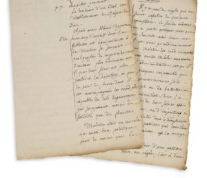 ROUSSEAU Jean-Jacques (1712 - 1778) MANUSCRIT autographe, Testament du Cal de Richelieu... ; 6 pages in-4 avec marge, sur 3 feuillets. Notes sur les femmes dans la deuxième partie du Testament politique du Cardinal de Richelieu. En vue de l'ouvrage sur les femmes que Rousseau entreprit entre 1746 et 1750 pour sa protectrice Mme Louise DUPIN (1706 - 1799) et qui ne vit jamais le jour. «Le bonheur d'un Etat est l'établissement du Règne de Dieu. Après avoir blâmé l'hypocrisie, il dit : beaucoup d'esprits dont la foiblesse est équipollente à la malice se servent quelquefois de ce genre de ruses d'autant plus ordinaire aux f[emmes] que leur sexe est plus porté à la dévotion, et que le peu de force dont il est accompagné les rend plus capables de tels déguisemens qui supposent moins de solidité que de finesse». Et Rousseau commente : «MOLIÈRE étoit en morale un aussi bon politique pour le moins que le Cal de Richelieu. Il a démasqué et corrigé certains vices, et il a trouvé l'original de son Tartuffe chez les h[ommes]. Selon ce passage il auroit dû le prendre chez les f[emmes]». Puis il revient au cardinal de Richelieu : «Après avoir parlé de ce qui convient selon les différens cas ; de là vient, dit il, que les f., paresseuses et peu secrettes de leur nature sont si peu propres au gouvernement. Que si on considère encore qu'elles sont fort sujettes à leurs passions, et par consequent peu susceptibles de raison et de justice ; ce seul principe les exclud de touttes administrations publiques»... Etc.