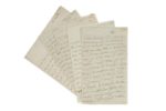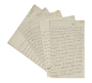STAËL Germaine Necker, baronne de (1766 - 1817) 5 L.A., 1803 - 1812, à Claude HOCHET ; 16 pages in-8 et 4 pages in-4 (le bas du 2e feuillet de la 3e lettre a été coupé, et 3 lignes et 6 mots de la 4e ont été raturés). Très intéressante correspondance à son fidèle ami et confident Claude Hochet. [Claude HOCHET (1772 - 1857), journaliste au Publiciste de Suard, fit la connaissance en 1796 dans le salon de Suard de Benjamin Constant et Mme de Staël, dont il restera jusqu'à la mort l'ami et le correspondant fidèle. Il abandonnera peu à peu la littérature pour la carrière administrative, mais restera pour Mme de Staël et Constant un confident et un ami dévoué, jouant entre eux le rôle d'agent de liaison et leur servant aussi d'intermédiaire et d'informateur.] Metz 7 novembre [1803]. Départ de France pour l'Allemagne après avoir reçu son ordre d'exil. Elle a reçu et brûlé sa lettre «qui contenoit de si nobles preuves de votre amitié je désire que vous n'en parliez jamais certain que le souvenir s'en retrouvera dans mon coeur mais il y a des moments où il faut tout éteindre, c'est presque mourir de son vivant. Je voulais dire par ma littérature métaphysique que j'écrirois à Mr Su[ard] ce que j'observerois en Allemagne [...] Non en vérité je ne veux rien imprimer, je ne sais quand je retrouverai mes facultés, j'ai souffert si horriblement que je ne suis pas sure d'en ressortir moi - du moins pour l'esprit. Ce départ de France me redonne toutes les douleurs de celui de Bondy pour l'imagination, c'est une terrible chose qu'une frontière et une grande épreuve pour le coeur que des adieux. [...] Quelle folie que de se présenter un voyage comme agréable je n'ai aucune curiosité et chaque objet nouveau secoue la peine et la fait mieux sentir». Elle ne savait pas que Mme SUARD avait écrit à son père : «Je lui suis attachée et pour elle et pour son mari qui a redoublé en moi un sentiment presque pénible tant il est vrai. Personne en France ne conçoit l'amitié mais je ne puis vous dire à quel point je m'en suis reconnue susceptible depuis que je frémis à l'aspect de l'étranger, même lorsqu'il m'apprend à quel point ma célébrité est générale, comme je donnerois ce droit d'aînesse pour six mois de bonheur, je n'ai plus rien que de vulgaire depuis qu'il faut se séparer de tout ce que j'aime, le 1er C[onsul] n'a pas su à quel point je me serois annullée avec plaisir»... [Rouen] ce lundi [3 ou 10 novembre 1806]. Sur son amour pour Prosper de BARANTE : «Je vous donne ma parole d'honneur mon ami, que vous ne serez pas nommé à Pr. sur cette affaire d'argent» ; elle va payer ses dettes : «nous sommes tout à fait à cet égard sans gêne réciproque. Ce que je souhaiterois vivement c'est qu'il cherchat à se faire renvoyer à Paris - et ce n'est pas pour mon sentiment seul, c'est pour sa dignité que je le souhaite, c'est un homme qui peut tomber comme il peut s'élever, sa mobilité et son père combattent contre sa fierté et contre moi». Puis à propos du 17ème Bulletin de la Grande-Armée : «La reine de Prusse est la plus respectable femme du monde et Hullin [le général HULIN avait présidé la commission militaire du duc d'Enghien] pour commander à Berlin ! Vous parlez de bonheur en peut-il exister quand un objet si cher [Barante] est au milieu de tout cela. Ah je tremble à chaque instant qu'il ne s'engage dans une route qui fausse toutes les idées comme tous les sentiments, qui les fausse bien plus quand on est né une noble créature que quand on s'est trouvé d'accord naturellement avec tout cela. J'ai vu Mr de Tall. [TALLEYRAND] fondre en larmes trois heures au pied de mon lit quand j'étois malade la fermeté est le seul garant des dons reçus du ciel. Vous êtes bien généreux de me pardonner mon malheureux sentiment hélas il m'a rendu bien heureuse six mois m'en vaudra t'il davantage ?»... Elle a remarqué [dans le Publiciste] l'extrait de l'histoire Auguste : «j'aurois du vous y reconnoitre puisque le courage m'en avoit frappée. Si ceci dure encor dix ans, on ne saura plus en France ce que c'étoit que l'honnêteté, cela s'appellera le radotage des vieillards. Tant que nous sommes jeunes encore au moins ils ne peuvent pas attribuer la délicatesse à la foiblesse». Elle explique à Hochet qu'elle souhaite lui prêter «de l'argent pour acheter une ferme [...] je regarde cela comme une bonne spéculation pour moi je vous en avertis car vous êtes le plus sur de tous les débiteurs»... Quant à la date de publication de son roman [Corinne], elle voudrait «que cette guerre fût finie je trouve indécent de se montrer sur des sujets d'agrément au milieu des larmes de l'Europe», et il faut arranger «l'affaire de la censure». Elle est en train d'acheter «une terre [Acosta] à deux lieues plus près de Paris que Mantes il faut voir si l'on m'y laissera»... [Genève] ce 26 mars [1809]. Sur la tragédie Wallstein de Benjamin Constant, et sur De l'Allemagne. «On peut trouver plus ou moins d'intérêt dans la nature même du sujet de Valstein mais ne pas admirer Alfred et Thécla mais ne pas sentir la beauté noble et simpl