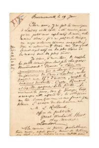 VERLAINE Paul (1844 - 1896) L.A.S. «P. Verlaine», Bournemouth 19 janvier [1877, à son ami Edmond LEPELLETIER] ; 2 pages in-8. Sur son séjour à Bournemouth. Il a bien fait sa commission, et a remis sa carte en mains sûres, «ainsi qu'un petit mot explicatif de moi [...] des plus clairs». Il lui rappelle la commission dont il l'a chargé : «trouver à Paris, un commissionnaire qui se charge d'envoyer les journaux de Paris à Londres [...] tu obligerais un très brave homme et me ferais grand plaisir. [...] Me revoici ici pour probablement trois mois, après quoi, muni de testimonies en règle, - je repars et me refixe pour la Capitale du Monde, “où l'on rigole”, comme dit le poète ! Là, vie plus monastique que jamais, avec pour seule joie, le petit [Lucien Létinois ] à voir de temps en temps. - il va sans dire que si tu peux découvrir un emploi, fut-il modeste, n'importe quoi d'un peu honorable, - me faire signe [...]. Comme la prudence du serpent est toujours de mise, je te prierai de garder le silence sur moi et surtout sur mon adresse, ceci très sérieux»... Il attend de ses nouvelles et «si quelquefois tu voulais m'envoyer des paquets de journaux, c'est ça qui serait batte !»... Il laisse son adresse, «2, Westburn Terrace, Bournemouth»... Correspondance générale (éd. Pakenham), t. I, n° 77-2.