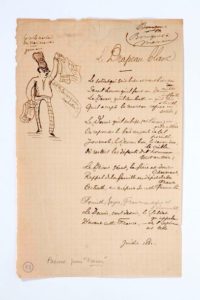 VERLAINE Paul (1844 - 1896) POÈME autographe avec DESSIN, Le Drapeau blanc, Juillet 1881 ; 1 page in-8 sur papier quadrillé. Poème patriotique, illustré d'un amusant dessin original à la plume. Ce sonnet patriotique a paru en 1888 dans le recueil Amour, sous le titre définitif de Drapeau vrai, et dédié au poète Raymond de La Tailhède (1867 - 1938). En haut de ce manuscrit mis au net, Verlaine a noté un titre alternatif (ou titre d'un groupe de poèmes) : «Bouquet à Marianne». Ce manuscrit présente des variantes avec le texte publié. «Le soldat qui sait bien et veut bien son métier Sera l'homme qu'il faut au Devoir inflexible, Le Devoir, qu'il combatte ou qu'il tire à la cible, Qu'il accepte la mort ou refuse un setier ; [...] Famille, foyer, France antique et l'immortelle, Le Devoir, seul devoir, le Soldat qu'appela D'avance cette France, - or l'espérance est telle». Dans la marge supérieure gauche, Verlaine a fait un amusant dessin à la plume d'un colporteur de journaux, vêtu d'un pantalon à carreaux et coiffé d'une haute casquette. Il brandit différentes feuilles, Voltaire, le XIXe siècle, la République française, tenant dans l'autre main le Temps et les Débats, et crie dans une bulle : «Achetez les dergnières nouvelles !!» Au-dessus, cette légende : «Là c'est le marchand des vrais mauvais journaux». PROVENANCE Collection Victor Sanson (son petit cachet VS ; vente 13 mars 1936, n° 184) ; Dominique de Ville pin , Feux & flammes. Un itinéraire politique. I Les Voleurs de feu (28 novembre 2013, n° 67).