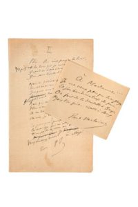 VERLAINE Paul (1844 - 1896) POÈME autographe signé «PV», [Le Livre d'Esther, II] ; 1 page in-8. Poème sur sa maîtresse Philomène Boudin. Manuscrit de travail de ce poème de quatre quatrains, avec de ratures et corrections, second poème du diptyque Le Livre d'Esther (surnom de Philomène), recueilli en 1903 dans les OEuvres posthumes en appendice de Dédicaces. «Phi... B... c'est presque la lune, Mais la lune que je vois Quand tu cèdes à ma voix Qui sans doute t'importune»... On joint un quatrain autographe signé «Paul Verlaine», À Madame... (1 page in-12) : «Je ne veux plus que tu me gruges»...