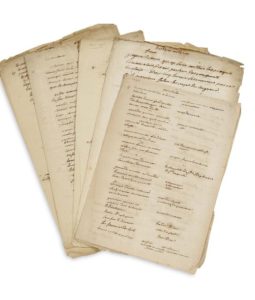 VOLTAIRE (1694 - 1778) 5 MANUSCRITS autographes, [vers 1752]. ; 16 pages et quart in-fol. (environ 34 x 21,5 cm) sur 4 bifoliums et un feuillet simple. Importante réunion de notes relatives entre autres à l'histoire, l'histoire naturelle, la littérature, le procès de Damiens et les arts. Ces feuillets de notes, jetées sur le papier sans ordre apparent, font partie d'un vaste ensemble de carnets, fragments de carnets et feuillets conservés dans des collections publiques et privées. Ils sont répertoriés dans les OEuvres complètes de Voltaire publiées sous la direction de Th. Besterman (The Voltaire Foundation, 1968, p. 22 et pp. 174 et suivantes) et sont tirés du même cahier que ceux conservés à la Pierpont Morgan. Les feuillets ont été numérotés au crayon (107 et 112 à 115), lors du récolement des notes et carnets de Voltaire. Voir aussi Andrew Brown, «Des notes inédites de Voltaire : vers une nouvelle édition de ses carnets», in Cahiers Voltaire 8. Parallele. 4 pages d'un bifolium (numéroté 107, et mention «copié»). Notes disposées sur deux colonnes, celle de gauche consacrée à la mythologie, et celle de droite à la Bible : .«La nymphe Amalthée a la corne d'abondance / 5000 hommes nouris avec cinq pains et trois poissons. - Les filles d'Anius grand pretre de Baccus changent l'au en vin et en huile / noces de Canaa. - Atalide pouvoit resusciter et mourir tant qui vouloit Jesucrit resuscite etc.»... Etc. Sur le 2e feuillet, les notes deviennent continues. «Les ebronites disaient que Jesus netait pas dieu les docetes qu'il n'était pas homme, les ariens quil n'était pas comme son père»... etc. La dernière page est en partie consacrée aux Juifs : «les juifs pretendent qu'Adam eut deux femmes la premiere nommée Lilli qui le fit cocu, et Eve la seconde, il fit divorce avec la premiere et Eve fut tirée de sa cote»... Etc. Histoire moderne. France (2 pages, feuillet numéroté 112). «Gregoire de Tours qui est saint car tous les eveques l'étaient alors, dit en parlant des assasinats de Clovis Dieu luy livrait ses ennemis parce qu'il marchait selon les voyes du seigneur. [...] Les cretins en Valais - race d'imbeciles nombreuse»... Etc. Le verso est principalement consacré à l'interrogatoire de DAMIENS en 1757 : «dit qu'il a assassiné le roy pour Dieu et pour le peuple [...] ecrit au roy de sa prison, que l'archeveque de Paris est la cause de tout le trouble. Si le roy eut fait trancher la tete a 3 ou 4 eveques, cela ne serait pas arrivé [...] dit que le roy est trop bon, qu'on l'empeche de voir clair, et que c'est pour cela qu'il l'a assassiné»... Etc. Histoire moderne et littérature (3 pages d'un bifolium numéroté 113 avec la mention «copié»). - «Passages tirez de Gui Patin» : «Ce filou de cardinal Mazarin n'a eü pitié de personne, meme en mourant. [...] Luxe. Tous les auteurs louent la temperance des Spartiates des anciens romains. Cela veut dire, sages et honnêtes citoyens privez vous de tout pour aller vous baigner dans le sang des nations voisines allez voir saccager tout le fruit de leur industrie et quand vous aurez tout pillé, manquez de tout pour votre peine»... Puis des notes du Galilée, Benoît XIV : «recueil de ses facéties. Il disait a Farinelli qui se vantait d'avoir été heureux en Espagne vous y avez donc trouvé ce que vous aviez laissé icy ?»... Etc. Littérature et arts (4 pages d'un bifolium numéroté 114). «Il fallait qu'il y eut en France plus de connaissance de la langue latine qu'ailleurs [...] Ovide nomme une foule d'ecrivains illustres de son temps inconnus aujourdhuy (ultima de ponto), Marsus, Rabirius [...] La musique chez les anciens enseignait la pronontiation le rithme le geste, comme la gramaire embrassait l'eloquence et la littérature»...Etc. Sur la dernière page, notes relatives à la musique, à l'Arioste ainsi qu'une longue énumération de diverses inventions en face desquelles figure le nom de l'inventeur. Histoire naturelle (4 pages d'un bifolium numéroté 115). «Les peches viennent de Perse, les abricots d'Iberie [...] Lanalize ne peut faire connaitre la composition des corps ; mettez dans un alambique une composition de farine, d'oeufs, de creme, de ris de veau, quel est le chimiste qui devinera que c'était un petit paté ? [...] Tout le gibier des alpes a les pattes velues il vit dans la nege, la nature pourvoit à tout. [...] A Strasbourg les bouchers ont un secret pour empecher les mouches d'aprocher, il faut que Reaumur invente ce secret. [...] Les singes nommez boggo, orang outan, baboon s'acouplent avec les femmes, et il n'est pas impossible qui ny en ait de la race. [...] Chez les hottentots le chef du village pisse sur l'échine des nouveaux mariez, c'est leur eau bénite»... Etc. PROVENANCE Ancienne collection Tronc-Jeanson (vente Christie's, Paris 6 novembre 2013, n° 148). (Quelques bords un peu effrangés)