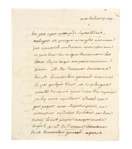 VOLTAIRE (1694 - 1778) L.A., aux Délices 23 mai [1763, à François de CHENNEVIÈRES] ; 2 pages et demie in-4. «Les gens ayant a peu près septante ans, malingres et presque aveugles n'écrivent pas comme ils voudraient mon cher ami et puis Dieu sait ce que deviennent lettres. Il y en a qui ne parviennent point» Ainsi il a écrit à M. de Varenne, secrétaire du Contrôleur général, qui n'a rien reçu ; Chennevières doit le connaître : «car il a de l'esprit et il fait de jolis vers. Je vous prie d'éclaircir avec luy cette aventure. [...] Il me parait que le parlement fait attendre bien longtemps sa réponse à M. le controleur général. Si les arrangements de finance qu'on m'a mandez sont tels qu'on le dit, il est bien sur qu'ils sont aussi raisonnables que nécessaires ; et je ne conçois pas comment le parlement peut s'y opposer. Il ne veut pas sans doute empecher que le roy paye ses dettes. Les anglais vainqueurs payent les leurs»... Correspondance (Pléiade), t. VII, n° 7769.