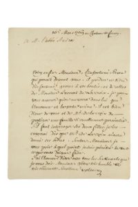 VOLTAIRE (1694 - 1778) L.S. «Voltaire», château de Ferney 10 mars 1769, à l'abbé Joseph AUDRA ; la lettre est écrite par son secrétaire Jean-Louis WAGNIÈRE ; 1 page in-4. Lettre qui semble inédite, au sujet de l'affaire Sirven. [Pierre-Paul SIRVEN (1709 - 1777), protestant de Mazamet, a été condamné à mort par contumace pour le meurtre de sa fille, qui aurait voulu se convertir au catholicisme. Voltaire prendra sa défense et prouvera son innocence, et Sirven sera réhabilité.] «Voicy enfin, Monsieur, l'infortuné Sirven qui parait devant vous. Il perdra ce titre d'infortuné graces à vos bontés, et à celles de Monsieur l'avocat de La Croix. Je peux vous assurer qu'on ne verra dans lui que l'innocence et la vertu même. Il est bien digne de vous et de Mr de La Croix de protéger une famille si cruellement persécutée»...