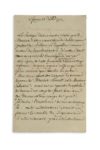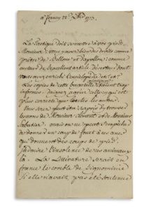 VOLTAIRE (1694 - 1778) L.S. «V», Ferney 22 décembre 1773, à Jean-François de SAINT-LAMBERT ; la lettre est écrite par son secrétaire Jean Louis WAGNIÈRE ; 1 page et demie in-8. Envoi de son poème La Tactique à l'académicien et encyclopédiste. «La Tactique doit se mettre à vos pieds, Monsieur ; vous y avez bien des droits comme prêtre de Bellone et d'Apollon ; comme auteur de l'excellent article déserteur dont vous avez enrichi l'enciclopédie, etca, etca. Les copies de cette bagatelle qui ont couru étaient trop informes. Daignez agréer celle-ci qui est plus correcte que toutes les autres. Vous serez peut-être surpris d'y trouver les noms de Monsieur Clément et de Monsieur Sabatier. Mais on ne peut s'empêcher de donner un coup de fouet à ces ânes qui donnent des coups de pied. J'admire l'insolence de animaux-là. La Littérature serait en France le comble l'ignominie si elle n'avait pas été soutenue par l'honneur que vous lui avez fait»... Correspondance (Pléiade), t. XI, n° 13554