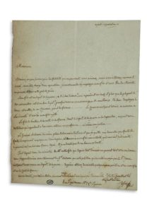CASSINI Jean-Dominique (1748 - 1845) astronome et cartographe L.A.S. «Cassini», Paris 14 prairial X (3 juin 1802) ; 1 page in-4. Il prie son correspondant d'intervenir auprès du Ministre de la Guerre en faveur de son fils... «Mon fils est au dépôt de la guerre ; a-t-il des talens ? oui répondent ses chefs, et plus que la plupart de ses camarades. Est-il un bon sujet ? parfait nous en connoissons peu de meilleurs. Eh bien employez le donc, admettez le au Concours, point de faveurs... le Concours n'est point admis, on nomme à l'ancienneté et voilà mon fils rejetté. Le fils de l'auteur de la carte de la France, dont le dépôt de la guerre a les dépouilles, ne peut, avec des talens qui répondent à son nom, obtenir de préférence, ni même de justice». Le général Andréossy lui-même n'a rien pu pour lui, ne pouvant faute de fonds, employer un élève de plus : «tout dépend donc du Ministre [...] De grâce obtenez du ministre quelque réponse positive et sur mon fils et sur la Carte de France»...