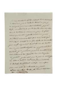 LANNES Jean (1769 - 1809) maréchal d'Empire L.A.S. «Lannes», [14 juillet 1808], à sa femme la maréchale LANNES à Paris ; 1 page in-4 , adresse avec cachet de cire rouge (brisé) Belle lettre familiale. Elle lui a recommandé «de dire à mon père de tacher de t'aimer un peu, je ni menquerai pas à mon retour à Lectoure ; jespere aussi ma chere Louise, que tu voudras bien dire à ton ami, de continuer de m'aimer un peu ; il faut avouer que tu es bien injuste envers mon père, qui t'aime aumoins autant qu'a moi, ainsi que ma soeur. En vérité tu me fais crindre de ton amitié pour eux, sepandent ils ont été l'un et l'autre dans le plus mortel chagrin en apprenant ton accidant ; je te pardonne, quand tu connetras mieux leurs santimens à ton egard, tu leur rendras plus de justice»...