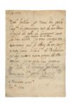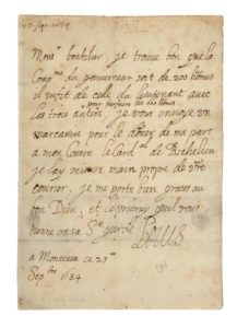 LOUIS XIII (1601 - 1643) L.A.S. «Louis», Monceaux 23 septembre 1634, à Claude BOUTHILLIER (Surintendant des Finances) ; 1 page petit in-4, adresse au dos avec cachet de cire aux armes royales. «Monsieur Boutilier, je trouve bon que la Comp[ag]nie du gouverneur soit de 200 homes, il sufit de celle du lieutenant avec les trois autres pour parfaire les 600 hommes. Je vous envoye un marcassin pour le doner de ma part à mon Cousin le Cardal de Richelieu, je lay mis en main propre de v[ot]re courrier, je me porte bien graces au bon Dieu, et le prieray quil vous tienne en sa S[ain]te garde».
