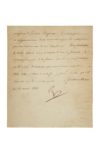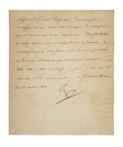 NAPOLÉON Ier (1769 - 1821) L.S. «Napoleon», Fontainebleau 13 avril 1814, au général DEJEAN ; ¾ page in-4 Rare lettre d'adieux à un fidèle serviteur, au lendemain de sa tentative de suicide. [Paris a capitulé le 31 mars, le Sénat et le Corps législatif ont voté la déchéance de l'empereur le 3 avril, le 6 avril Napoléon a abdiqué et le même jour le Sénat a voté la nouvelle Constitution. Napoléon a tenté de se suicider dans la nuit du 12 au 13 avril 1814, et il va quitter Fontainebleau le 20 avril.] «Monsieur le Général Dejean, Je ne veux pas m'éloigner de vous sans vous témoigner la satisfaction que j'ai toujours eue de vos bons services. Vous soutiendrez la bonne opinion que j'ai conçue de vous, en servant le nouveau Souverain de la France avec la même fidélité et le même dévouement que vous m'avez montrés».. [Jean-François-Aimé DEJEAN (1749 - 1824), ingénieur avant la Révolution, devenu général de division puis directeur des fortifications, fit une carrière politique à partir du Consulat : nommé conseiller d'État, il fut chargé par Bonaparte de surveiller l'exécution de la convention d'Alexandrie (1800), puis l'organisation de la République ligurienne (1800-1802). Il exerça en France comme ministre de l'Administration de la guerre (1802 - 1810) et sa carrière se poursuivit ensuite à diverses places, avec une courte parenthèse après les Cent Jours. Il mourut pair de France.] On joint une L.S. du général de LA MORICIÈRE, 14 juin 1865 (2 p. in-4). (Légère mouillure)