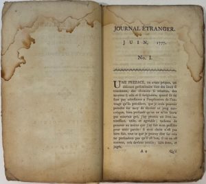 JOURNAL ÉTRANGER DE LITTÉRATURE, DES SPECTACLES ET DE POLITIQUE Ouvrage périodique N° 1, juin 1777. La revue complète comporte 23 vol., de juin 1777 à mai 1778. Londres, De l’Imprimerie du Sieur Bigg, dans le Strand ; & se trouve chez le Sieur Elmsley, dans le Strand ; & chez le Sieur Laboissière, St James Street, près la Cour. Les articles ne sont pas signés. Bien complet des 2 pages dépliantes de musique. 1 vol. in-8 br. Notes manuscrites de Vasseur (1 f.). Quelques mouillures. Poésies, Mélanges littéraires, Romans, Causes célèbres, Mode, Agriculture, Anecdotes, Spectacles, Nouvelles politiques, Articles d’Histoire littéraire ou de Philosophie, Planches de musique…