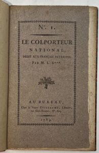 LE COLPORTEUR NATIONAL Dédié aux Français patriotes par M. L.S*** N° 1, octobre 1789-n° 2, novembre 1789, Paris, Au bureau, Chez la Veuve Guillaume, Libraire. Collection complète. 2 numéros en 2 livraisons en 1 vol. in-8 relié (couverture du n° 1 conservée). Notes manuscrites de Vasseur (1 f.).