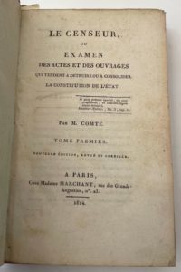 LE CENSEUR Ou Examen des actes et des ouvrages qui tendent à détruire ou à consolider la constitution de l’État Juin 1814-6 septembre 1815. À Paris, Chez Madame Marchant. Rédigés par MM. Comte et Dunoyer, avocats. Le Tome 3 comporte un article important de Saint-Simon (« Lettre sur l’établissement du parti de l’opposition »). 6 vol. in-8 reliés d’époque (demi-maroquin vert, dos orné, motifs composés de fleurons aux petits fers avec losanges et guirlandes). La 1ère page du n° 2 est en partie déchirée. Il semble qu’il manque 4 pages du Bulletin du Censeur entre les livraisons 2 et 4, qui seraient paginées de 9 à 12. Les pages 29 et 30 du Bulletin du Censeur sont en partie déchirées. Pour être complet il faut 7 vol. mais le 7e qui a été saisi est quasiment introuvable. Notes manuscrites de Vasseur (1 f.). La revue fut reprise en 1817 sous le titre « Le Censeur européen » : LE CENSEUR EUROPÉEN Ou Examen de diverses questions de droit public, et des divers ouvrages littéraires et scientifiques, considérés dans leurs rapports avec les progrès de la civilisation Février 1817-1818. À Paris, Au bureau de l’administration. Rédigés par MM. Comte et Dunoyer. 6 vol. in-8 reliés d’époque (plein cartonnage vert, étiquettes au dos, vertes et rouges avec encadrements filets or ; plats légèrement frottés). Pour être complet il faut 12 vol. (février 1817-17 avril 1819). Notes manuscrites de Vasseur (2 ff.). Joint : – Livraison de la Revue des Sciences humaines consacré au Censeur européen (n° 114, avril-juin 1964). Le seul journal de l’époque véritablement indépendant. Parut d’abord par livraisons de 2 ou 3 feuilles ; après la loi du 21 octobre, pour échapper à la censure, il ne parut plus qu’à des époques indéterminées, par livraisons de 20 feuilles. Le 7e volume, longtemps retenu sous les scellés, se trouve difficilement. Repris en février 1817, sous le titre « Le Censeur européen ». Repris une troisième fois deux mois après, quand la liberté eut été rendue aux journaux existants, et le droit d’en créer de nouveaux à tout le monde ; il prend alors le grand format, et devient quotidien sous le titre simplifié de « Le Censeur Européen » (15 juin 1819-22 juin 1820, 372 numéros en 2 séries). Cessa au rétablissement de la censure en 1820, et fut réuni au Courrier Français. (Hatin, pp. 317-318).