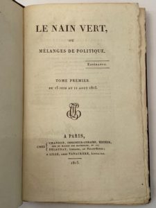 LE NAIN VERT, OU MÉLANGES DE POLITIQUE puis LE GÉANT VERT, OU MÉLANGES DE POLITIQUE ET DE LITTÉRATURE Tome I : n° 1, 15 juin 1815-n° 13, 7 août 1815 ; Tome II : n° 14, 11 août 1815-n° 21, 15 septembre 1815, puis sous le titre Le Géant Vert : n° 22, 20 septembre 1815-n° 24, 28 septembre 1815 ; Tome III : n° 25, 5 octobre 1815-n° 40, 20 décembre 1815. Il manque les n° 34 et 35. À Paris, chez Chanson, Imprimeur-Libraire, Éditeur ; Delaunay, Libraire ; à Lille, chez Vanackere, Libraire. 38 livraisons en 3 vol. in-8 reliés. Notes manuscrites de Vasseur (1 f.).