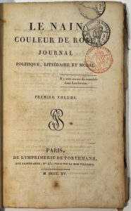 LE NAIN COULEUR DE ROSE Journal politique, littéraire et moral Tome I : n° 1, 15 septembre 1815-n° 18, 10 décembre 1815 ; Tome II : n° 1, 15 décembre 1815-n° 18, 10 mars 1816. Tête de collection. Pour être complet la revue doit avoir 47 livraisons du 15 septembre 1815 au 5 mai 1816. Paris, De l’Imprimerie de Porthmann. 36 livraisons en 2 vol. in-8. Le Tome I contient 10 planches h.-t. en couleurs, certaines dépliantes ; le Tome II : 5 planches h.-t. en couleurs, certaines dépliantes. Notes manuscrites de Vasseur (2 ff.). Dans le Tome I, p. 432, une note manuscrite au crayon (écriture de l’époque) indique : « Cette gravure fut retirée sur l’ordre de l’autorité. J’ai pu cependant me la procurer. On la trouvera à la p. 425. » Intéressante publication légitimiste, à la fois politique et littéraire, publiée par Emmanuel Théaulon et Armand Dartois.