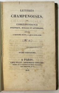 LETTRES CHAMPENOISES ou Correspondance politique, morale et littéraire, adressée à Madame De ***, à Arcis-sur-Aube 1ère série, N° 1, 1817-n° 36, 1819. Paris, Chaumerot, Jeune, Libraire, puis Chez Pillet, Imprimeur-Libraire. Collection complète de la 1ère série rédigée par Mély-Janin. 36 numéros en 36 livraisons en 3 vol. in-8 reliés. La revue reparut en 1820 et dura jusqu’en 1825 avec comme sous-titre : Correspondance morale et littéraire.