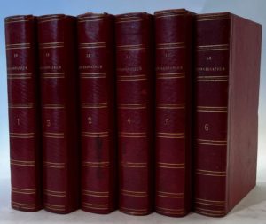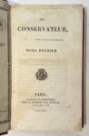LE CONSERVATEUR Le Roi, la Charte et les honnêtes gens N° 1, octobre 1818-n° 78, mars 1820. Paris, Au bureau du Conservateur, chez Le Normant Fils, Éditeur, Directeur : Chateaubriand. Textes de Chateaubriand (qui signait « Le Vicomte de Chateaubriand », « Le Conservateur », ou de la seule initiale « Z »), le vicomte de Bonald, Marie-Barthélémy de Castelbajac, Custine, Joseph Fiévée, Lamartine, Lamennais, O’Mahony, A. Martainville, Jules de Polignac, de Villèle, etc. Collection complète. 78 livraisons en 6 vol. in-8 reliés (reliure d’époque, demi basane rouge à grains longs, filets au dos, très petite différence de reliure au Tome VI). Revue ultra royaliste, créée en opposition à La Minerve, organe royaliste libéral dirigé par Benjamin Constant. Le Conservateur, qui cessa de paraître lorsque la censure fut rétablie à la suite de l’assassinat du duc de Berry, est défini ainsi par Hatin (pp. 338-340) : « C’est dans ce recueil justement célèbre, foyer ouvert à tous les regrets, à tous les ressentiments, à toutes les exagérations des ultras, qu’il faut surtout chercher la politique royaliste pendant les 18 mois qu’il vécut. »