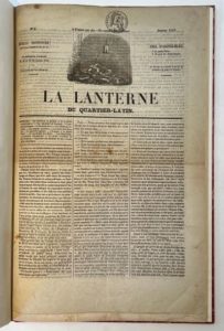 LA LANTERNE DU QUARTIER-LATIN 1ère année : n° 1, janvier 1847-n° 8, août 1847 et n° 10, octobre 1847-n° 12, décembre 1847 ; 2e année : n° 1, janvier 1848-n° 3, 21-25 mai 1848 + 1 n° sans date de plus grand format. Il manque le n° 9 (septembre 1847). Le n° 3 de la 2e année portent le titre La Lanterne avec comme sous-titre : « Organe de la jeunesse républicaine-démocratique », et n° sans date de la 2e année : « Journal démocratique et social des écoles ». Paris, Rédacteur : Antonio Watripon. Jusqu’au n° 12 de la 1ère année, aucun article n’est signé et le journal est certainement entièrement rédigé par Antonio Watripon. À partir du n° 1 de la 2e année : Textes de Léon Danic, Charles Fillieu, J. Laravinière, J. Michelet, f.-V. Raspail, etc. Il semble que le n° sans date serait le n° 4 de décembre 1848. 14 livraisons in-folio et 1 livraison grand in-folio en 1 vol. in-folio relié.