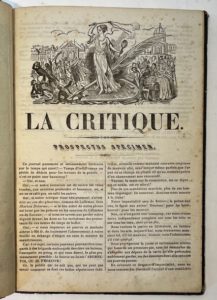 LA CRITIQUE Revue hebdomadaire de la Littérature, des Théâtres, des Beaux-Arts et des Sciences N° 1, 17 février 1850-n° 15, 5 juin 1850. Rédacteurs : Albert Blanquet et A.-C. Blouet. Textes de Albert Blanquet, A.C. Blouet, Augustin Chaho, Fulgence Girard, Louis Judicis, L. de La Croix-Mathieu, A. Lagarde, Paul de Lascaux, B. de Limouse, Charles Robin, A.-L. Tek-Nab, A. Tubole, Marie d’Ussy. Collection complète. 15 numéros en 15 livraisons en 1 vol. grand in-8 relié (en mauvais état). Notes manuscrites de Vasseur (2 ff.). Joint : – 1 numéro spécimen de février 1850 (4 p. in-folio) ; – 1 prospectus spécimen. Le n° 15 annonce la fin de la revue. En tête du volume est placée une couverture datée n° 13, 15 mai 1850. Or La Critique n’a pu paraître le 15 mai par suite de l’apposition de scellés sur le matériel d’imprimerie et ce n° 13 est daté à la première page de texte : 15-23 mai 1850.