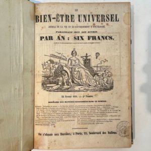 LE BIEN-ÊTRE UNIVERSEL Journal de la vie et du gouvernement à bon marché paraissant tous les lundis N° 1, 24 février 1851-n° 41, 30 novembre 1851. Paris, Gérant : Bourdilliat, Directeur : Émile de Girardin. Textes de Blanqui, Max Dreyfus, Émile de Girardin, Émile Jay, etc. Certains n° sont entièrement rédigés par Émile de Girardin. Dans le n° 3 : Discours de Victor Hugo à la séance de l’Assemblée le 17 juillet 1851. Les n° 28 à 31 sont entièrement consacrés à une étude sur l’impôt. Collection complète. 41 numéros en 41 livraisons en 1 vol. in-8 relié (reliure frottée). Notes manuscrites de Vasseur (1 f.).