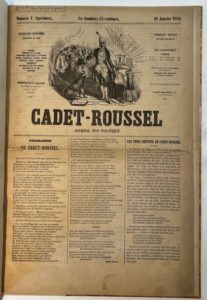CADET-ROUSSEL Journal non politique N° 1, 21 janvier 1855-n° 12, 8 avril 1855. Paris, Rédacteur en chef : Auguste Roussel, Propriétaire-Gérant : Charles Nolet. Textes de Jules Choux, Camille Delvaille, Alfred Delvau, Edmond Gros, Edmond Roche, Auguste Roussel, Ferdinand Silas, Louis Sylvain, Antonio Watripon, etc. Collection complète. 12 numéros en 12 livraisons en 1 vol. in-folio relié. Notes manuscrites de Vasseur (2 ff.).