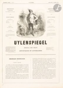 UYLENSPIEGEL Journal des ébats artistiques et littéraires 1ère année : n° 1, dimanche 3 février 1856-n° 52, dimanche 25 janvier 1857 ; 2e année : n° 1, dimanche 1er février 1857-n° 31, dimanche 30 août 1857. Uylenspiegel a duré jusqu’en 1864. Bruxelles, Directeur artistique : Félicien Rops, Directeur-Gérant : E. de Villebelle, Secrétaire de la rédaction : Victor Hallaux. Textes de Bénédict, Édouard Brun [Édouard Rousseau], Charles De Coster, Charles Delamare, Charles Didier, Victor Hovin [Victor Hallaux], Pierre Lachambeaudie, E. Pittore [Émile Leclercq], Karl Stur [Ernnest Parent], Noël Tisserand [Léon Weber], etc. Les 83 numéros ci-dessus forment une série complète dite « Série Rops », comme le confirme la note manuscrite de Rops en tête du 1er volume : « Je, soussigné, certifie que cette collection du journal Uylenspiegel est complète. Le journal du même nom qui a suivi cette publication n’était pas dirigé par moi. Paris, 31 juillet 1891. Félicien Rops. » Le n° 29 de la 2e année est en double. Dans le n° 49 de la 1ère année, la planche en double page est en double. Collection complète. 83 livraisons en 2 vol. in-folio reliés (mauvais état). 159 lithographies + 1 frontispice + le carton d’annonce, soit au total 161 lithos (84 de Félicien Rops, dont le frontispice ; 2 de Rops et Draner ; 10 de Degroux ; 9 de Gerlier ; 41 non signées. Notes manuscrites de Vasseur (1 f.). Joint : – 1 affichette éditée pour le lancement d’Uylenspiegel, composition signée Gerlier ; – 1 prospectus publicitaire en double exemplaire qui reproduit le frontispice de la 1ère page de chaque numéro d’Uylenspiegel, avec la composition signée M.D. [Madou] et cette mention : « le premier numéro a paru le 3 février 1856 » ; – 1 plaquette de 70 pages : La Vie et le Rêve de Charles De Coster de Henri Liebrecht (Éditions du Hibou, 1927). Publication de la plus grande rareté.