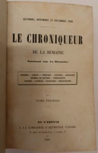 LE CHRONIQUEUR DE LA SEMAINE Paraissant tous les Dimanches N° 1, 12 octobre 1856-n° 18, 8 février 1857. Paris, Librairie Alphonse Taride. Rédigé successivement par Edmond Texier et Louis Ulbach. 18 numéros en 18 livraisons en 1 vol. in-12 relié. Notes manuscrites de Vasseur (3 ff.).
