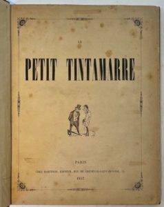 LE PETIT TINTAMARRE Paraît tous les Samedis. N° 1, 3 janvier 1857-n° 26, 27 juin 1857. Paris, Chez Martinon, Éditeur, Rédacteur en chef : Commerson. Rédigé en grande partie par Commerson. Abondamment illustré de vignettes sur bois de Nadar et de Daumier, et de deux très belles compositions à pleine page de Célestin Nanteuil, spécimens d’illustrations pour une édition de la Sainte Bible qui ne fut jamais publiée. 26 numéros en 26 livraisons sous couverture générale en 1 vol. in-4 relié. Notes manuscrites de Vasseur (1 f.). Joint : – 109 petites vignettes de Daumier extraites du Charivari, collées sur les pages de garde en début et fin de volume ainsi qu’au dos de la couverture générale. Périodique rare. Le Petit Tintamarre contient des nouvelles, des histoires humoristiques, des satires en vers. Dans chaque numéro, par Commerson et H. Maxance : « Le Code civil dévoilé, dédié aux emballeurs, aux réfugiés polonais et aux gardes nationaux sans ouvrage et notamment aux licenciés de l’école de droit pour cause d’incapacité notoire ».