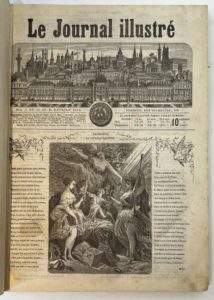 LE JOURNAL ILLUSTRÉ N° 1, 14 /21 février 1864-n° 65, 7 / 14 mai 1865. Paris. Textes de Émile de la Bédollière, Eugène Chavette, Victor Cochinat, Alexandre Dumas, Théophile Gautier, Méry, Jules Moinaux, Charles Monselet, Anne Radcliffe, Timothée Trimm, Maurice Wolff, etc. Illustrations de Gustave Doré, Gustave Janet, Henry de Montaut, Provost, Riou, etc. 65 livraisons en 1 vol. in-folio relié (reliure frottée).