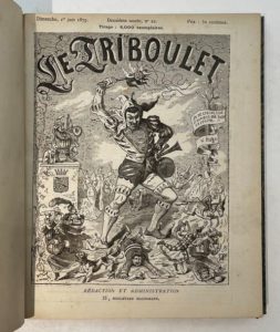 LE TRIBOULET Journal satirique, politique, illustré 1ère année : n° 1, 10 novembre 1878-n° 8, 29 décembre 1878 ; 2e année : n° 1, 5 janvier 1879-n° 52, 28 décembre 1879. Tête de collection de cet hebdomadaire satirique monarchiste. Devient Le Triboulet illustré en novembre 1880. Paris, Directeur-Rédacteur en chef : Saint Patrice [baron James Harden-Hickey], Secrétaire de rédaction : Jules de Gastyne, Gérant : Georges Lampre. Textes signés de nombreux pseudonymes. Abondamment illustré en pleine page, page de titre conçue par Bertall. 60 numéros en 60 livraisons en 2 vol. in-4 reliés (le n° 50 a été relié par erreur entre le n° 51 et le n° 52).