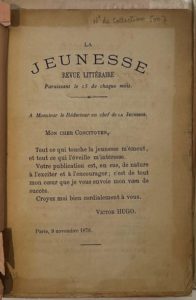 LA JEUNESSE Revue littéraire paraissant le 15 de chaque mois N° 1, novembre 1879-n° 9-10, juillet-août 1880. Périgueux, Rédacteur en chef : Émile Rial [Marius Pouget], Administrateur-Gérant : Édouard Véry. Textes de François Coppée, Antoine Cros, Alfred des Essarts, Emmanuel des Essarts, Arsène Houssaye, Victor Hugo (lettre), Rachilde, Jean Rameau, Émile Rial, Jean Richepin, Charles de Sivry, Léon Valade, etc. Collection complète. 10 numéros en 7 livraisons in-12 brochées. Notes manuscrites de Vasseur (8 ff.). Joint : – 1 L.D.S. de la Bibliothèque municipale de Périgueux (1968) confirmant que la revue est complète en 10 numéros.