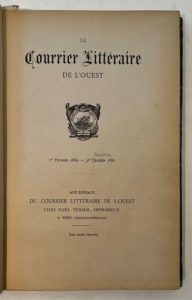 LE COURRIER LITTÉRAIRE DE L’OUEST N° 1, 1er février 1880-n° 18, janvier 1881. Pons (Charente-Inférieure), Aux bureaux du Courrier littéraire de l’Ouest, Chez Noël Texier, Imprimeur, Directeur-Rédacteur en chef : Paul de Sivray. Textes de François Coppée, Emmanuel des Essarts, Pierre Lagarenne, Alexandre Piedagnel, Jean Rameau, Gustave Rivet, Paul de Sivray, Joséphin Soulary, Jean Vinolaud, etc. 18 numéros en 18 livraisons en 1 vol. grand in-8 relié. Notes manuscrites de Vasseur (4 ff.). Exemplaire de Jules Claretie, avec son monogramme au dos de la reliure.
