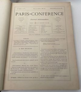 PARIS-CONFÉRENCE Journal hebdomadaire 1ère année : n° 1, 29 février 1880-n° 44, 26 décembre 1880. Paris, Librairie Paul Ollendorff, Directeurs : A. Vandelle et A. Billet, Rédacteur en chef : P. Varcollier. Conférences de P. Varcollier, Francisque Sarcey, Ferdinand de Lesseps, Mounet Sully, Coquelin aîné, Flammarion, Grandmoujik, Père Didon, etc. Poésies de François Coppée, Adolphe Carcassonne, Méry, etc. Articles et nouvelles de A. Billet, Ch. Grandmougin, E. Daudet, François Coppée, Dr Constantin James, Vast-Ricouard, H. de la Pommeraye, Francisque Sarcey, Maxime du Camp, etc. 44 livraisons en 1 vol. in-folio relié. Notes manuscrites de Vasseur (1 f.).