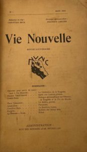 VIE NOUVELLE Revue littéraire N° 1, mars 1900-n° 3, mai 1900. Paris, Bruxelles et Wallonie, Directeur-Administrateur : Fernand Larcier, Rédacteur en chef : Christian Beck. Textes de Gabriel d’Annunzio, Joseph Bossi [Christian Beck], James Ensor, André Gide, Charles Guérin, Francis Jammes, Albert Mockel, Émile Verhaeren, Francis Vielé-Griffin, etc. Collection complète. 3 numéros en 3 livraisons en 1 vol. in-8 relié (couvertures conservées). Joint : – 1 L.A.S. de Teodor de Wyzewa adressée à Alfred Vallette (s.d., vers 1900) dans laquelle il est question de Christian Beck ; – Portraits par Félix Vallotton de : Francis Vielé-Griffin, Francis Jammes, Émile Verhaeren, André Gide.