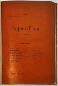 AUJOURD’HUI Revue mensuelle N° 1, Germinal an CX (15 avril 1902)-n° 4, Thermidor an CX (août 1902). Paris, Fondateurs : Ch.-A. Bertrand, Raphaël Dunois, Léon Frapié, Lucien Jean, L. Lévi, Charles Max, Charles-Louis Philippe, J.-G. Prod’homme, R.-P. Robertson, Directeur : Lucien Jean, Gérant : L. Badel. Textes de Ch.-A. Bertrand, Henri Damville, Delcourt, Diam, Raphaël Dunois, Léon Frapié, Lucien Jean, Jégou, Charles Max, Edmond Pilon, J.-G. Prod’homme, Henri Vandeputte. Charles-Louis Philippe, mentionné parmi les fondateurs, n’apparaît pas dans les sommaires. Collection complète. 4 numéros en 4 livraisons en 1 vol. in-12 relié (couvertures conservées). Notes manuscrites de Vasseur (2 ff.). Revue socialiste dont les tendances se manifestent clairement dans tous les articles : « Le Mouvement social et ouvrier », « Bulletin coopératif », … et aussi dans les nouvelles de Léon Frapié, Charles Max et Lucien Jean.