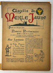 GAZETTE DU MERLE JAUNE Paraît 1 fois par mois N° préliminaire, s.d. [1903] puis, n° 1, s.d. [1903]-n° 12, s.d. [1903]. Le n° 6 contient 1 page de musique en supplément. Lyon, Presses du Merle jaune, Directeur : Henri Poncet. Textes de Auger Biendéfendu, Françoys de la Cervoise, Alain de Hault-Moustier, Henry d’Heurtebise, Pierre Jonas, Renoïl du Marais, Jules de Marsal, Jorge Maugis, Bernard Tavelle, Henri Tournelle, Loys Tristan, etc. Chaque numéro, tiré à 200 ex., porte la signature de l’un des collaborateurs. Papiers et encres de couleurs variables. Rarissime avec le n° préliminaire. 13 numéros en 13 livraisons en feuilles in-4. Notes manuscrites de Vasseur (1 f.)