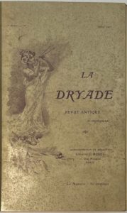 LA DRYADE Revue antique N° 1, janvier 1903-n° 24, décembre 1903. Paris, Administration et Rédaction : Librairie L. Borel. Textes de L. Borel, Cellarius, Alexandre Chevalier, Henri Delormel, Ernest Hugny, Alexandre Keller, Alexandre C. Mironesco, Jean Paty. 24 numéros en 24 livraisons en 1 vol. in-8 relié (couvertures illustrées par Marodon conservées).
