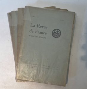 LA REVUE DE FRANCE ET DES PAYS FRANÇAIS N° 1, février 1912-n° 5, juin 1912. Il manque le n° 6 / 8, juillet-septembre 1912. La Revue de France et des Pays Français est la fusion en une seule revue mensuelle des Marches du Nord, des Marches de l’Ouest, des Marches du Sud-Ouest et de la Revue du Sud. Paris, Directeur-Rédacteur en chef : Olivier-Hourcade, Co-Directeur : C. Larronde, Secrétaire général : Fr. Dufour, puis Dorsennus. Textes de Roger Allard, Sylvain Bonmariage, Canudo, Paul Claudel, Léon Deubel, Franz Dufour, Charles Guérin, Francis Jammes, René Kemperheide, Carlos Larronde, Paul-Napoléon Roinard, Émile Verhaeren, Francis Vielé-Griffin, Tancrède de Visan, etc. 5 numéros en 4 livraisons in-4 brochées. Rousseurs. Notes manuscrites de Vasseur (1 f.). Joint : – Bulletin de la Société des Amis de Léon Deubel (n° 23, avril 1948) ; – 1 L.A.S. de Eugène Chatot à André Vasseur, avec la réponse de Vasseur à ce dernier.