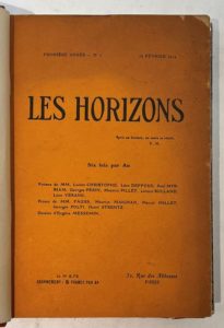 LES HORIZONS N° 1, 15 février 1912-n° 10, juin 1913. Paris, Directeurs : Henri Strentz, Marcel Millet, Maurice Millet. Textes de Jean-Richard Bloch, Francis Carco, Léon Deffoux, Charles Dullin, Fagus, Georges Fourest, Maurice Magre, Maurice Maignan, Louis Mandin, Marcel Millet, Paul Myrriam, Louis Nazzi, Cécile Périn, Maurice Pillet, Georges Polti, Jules Romains, Han Ryner, Henriette Sauret, Henri Strentz, Théo Varlet, Léon Vérane, Léon Werth, Walt Whitman, etc. Illustrations de Bracquemont, Eugène Messemin, Géo Scalup, Tobeen. 10 numéros en 10 livraisons en 1 vol. in-8 relié (couvertures conservées). Dans le numéro de la revue Belles lettres (décembre 1924) consacré à « une enquête sur les revues d’avant-garde », Marcel Millet signale que Les Horizons parurent jusqu’en 1914. Roméo Arbour ne signale que 9 numéros.