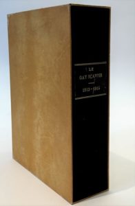 LE GAY SCAVOIR N° 1, 10 mars 1913-n° 6, 15 mai 1914.Il manque le n° 7 (dernier numéro paru) du 15 juillet 1914. En janvier 1914, absorbe L’Île sonnante. Paris, Administration : Dominique Combette, Ernest Dufour, René Morand, Maurice Pillet, Henri Strentz puis, à partir du n° 4 : Directeur : Henri Strentz, Secrétaire de la rédaction : G.A. Péronnet. Textes de Guillaume Apollinaire, Albert de Bersaucourt, Henriette Charasson, Dominique Combette, Émile Cottinet, Guy-Charles Cros, Léon Deubel, Léon Deffoux, Fagus, Roger Frène, Henri Hertz, Philéas Lebesgue, Louis Mandin, Marcel Martinet, René Morand, Vincent Muselli, Maurice Pillet, Michel Puy, Louis Pergaud, Cécile Périn, Edmond Pilon, Henri de Régnier, Gaston Sauvebois, Henri Strentz, Léon Vérane, Tancrède de Visan, Émile Zavie, etc. 6 numéros en 6 livraisons grand in-8 brochées sous emboîtage. Notes manuscrites de Vasseur (2 ff.). Joint : – 1 L.A.S. de Eugène Chatot à André Vasseur (mai 1951) dans laquelle il est question du n° 7 du Gay Scavoir ; – 1 carte postale (vue générale de Landresse, pays natal de Louis Pergaud) datée 6 août 1914 avec quelques lignes autographes de Louis et Delphine Pergaud à Mme Chatot.