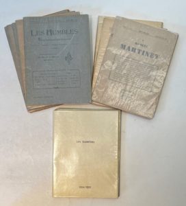 LES HUMBLES Revue littéraire des Primaires 1ère série : 1ère année : n° 1, 10 octobre 1913-n° 3, décembre 1913-janvier 1914 ; 2e année : n° 1, janvier-février 1914-n° 2, février-mars 1914 + cahier n° 8 / 9, août-septembre 1934 (« La Guerre ») ; cahier n° 7, juillet 1935 (« Au Congrès des Écrivains pour la défense de la culture ») ; cahier n° 1 / 2 / 3, janvier-mars 1936 (« À Marcel Martinet ») ; cahier n° 11 / 12, novembre-décembre 1938 (Victor Serge : « Résistance »). La 2e série débuta le 1er mai 1916. Cette revue paraissait encore en 1939. Roubaix, puis Paris, Directeur : Maurice Bataille, puis Maurice Wullens. Textes de Maurice Bataille, André Breton, Georges Céré, Alexandre Desvachez, Paul Fort, Jacques Froissard, Kizil Kurt, Magdeleine Paz, Henry Poulaille, René Renard, Gaetano Salvemini, Victor Serge, Maurice Wullens, etc. Joint : – 1 L.A.S. de Le Révérend, collaborateur de la revue et qui parle de celle-ci (s.d.). Les Humbles ont pour supplément Les Superbes : LES SUPERBES Supplément à la revue les Humbles publié par Édouard Dujardin N° 1, mai-juin 1934-n° 7, novembre 1935. Paris, Directeurs : Édouard Dujardin, Maurice Wullens. Textes de Félicien Challaye, Daniel-Rops, Édouard Dujardin, Luc Durtain, Georges Friedmann, René Lalou, Marcel Martinet, René Maublanc, Maurice Parijanine, Romain Rolland, Jules Romains, Maurice Wullens. Collection complète. 7 numéros en 7 livraisons in-12 brochées.