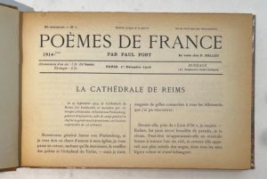 POÈMES DE FRANCE Par Paul Fort Bulletin lyrique de la guerre N° 1, 1er décembre 1914-n° 30, 1er janvier 1917. À partir du n° 27 (1er septembre 1916) les Poèmes de France paraissaient dans le journal L’Opinion avant de paraître en bulletins. Paris, En vente chez R. Helleu, Directeur : Paul Fort. Collection complète. 30 numéros en 30 livraisons en 1 vol. in-8 à l’italienne relié. Joint : – Le n° 165 (10 mai 1939) de Les Amis de 1914, Bulletin Hebdomadaire de l’Académie de la Coupole (réception de Paul Fort) ; – 4 articles de presse consacrés à Paul Fort ; – 1 bulletin d’abonnement aux Poèmes de France ; – 1 bulletin de souscription à l’Anthologie des ballades françaises de Paul Fort.