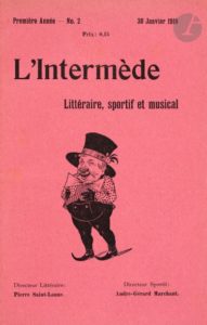 L’INTERMÈDE Littéraire, sportif et musical : Journal des Prisonniers Français du Camp de Würzburg N° 1, 23 janvier 1916-n° 85, 21 novembre 1918. Le n° 85 annonce l’arrêt de la publication. Le n° 15 (16 juillet 1916) a été interdit : il a été remplacé par un n° 15 bis daté du 19 juillet. La suspension entre le 2 avril 1917 et le 6 octobre 1917 est expliquée dans le n° 48 : de nombreux départs du camp (dont Pierre Saint-Lanne qui est parti à Constance). C’est l’exemplaire de Pierre Saint-Lanne avec sa signature en 1ère page du 1er volume et son étiquette imprimée, collée au dos de chaque volume. Directeur littéraire : Pierre Saint-Lanne, Directeur sportif : André-Gérard Marchant. Textes de Maurice Béguin, Jean-Paul Berty, Henri Borel, G. Boulard, William Clochard, Sergent Combes, René Duchemin, Septime Gorceix, Claude Pellegrin, François Pellegrin, André Pons, Pierre Saint-Lanne, Charles Soulas. Collection complète. 5 vol. in-8 reliés sous emboîtage. Joint : – 11 pages extraites de la revue Les Archives de la Grande Guerre contenant sous la signature de Septime Gorceix un article intitulé : « L’Intermède, journal d’un camp de prisonniers en Allemagne. » C’est l’histoire du journal et en particulier du n° 15 interdit ; – Le manuscrit de « À nos morts », signé Sergent Combes, publié dans les n° 3 et 4 ; – 3 programmes de récréations données au camp de Würzburg en 1916 ; – 1 programme de l’Orchestre symphonique des Internés alliés donné à Vevey le 18 septembre 1917 ; – 2 croquis humoristiques de guerre, signés Dunand ; – 1 coupure du Mercure de France (1er octobre 1916) signalant L’Intermède ; – les n° 34 à 47 en double, reliés en 1 volume. Dans la revue Les Archives de la Grande Guerre, Septime Gorceix présente ainsi L’Intermède : « Une des plus singulières manifestations de la vie des camps en Allemagne, fut l’éclosion de journaux rédigés en français par les prisonniers. Envoyés dans les pays neutres et en France, ces feuillets d’exil pouvaient présenter la captivité sous un aspect souriant et servir de témoignage contre la campagne menée par la presse de l’Entente. Ce fut certainement en vue de cette action de propagande que le Gouvernement Allemand autorisa leur publication. Mais le piège était vraiment trop grossier. Les prisonniers français, malgré les efforts de la Censure, surent défendre leur indépendance de pensée et de sentiment. Un des journaux accueillis avec la plus grande sympathie par les familles françaises et la presse parisienne fut l’Intermède, journal hebdomadaire du Camp de prisonniers de Galgenberg, à Würzburg, en Bavière, qui, sous le format d’une revue, parut, avec quelques interruptions, du 23 janvier 1916 jusqu’à l’armistice. […] »