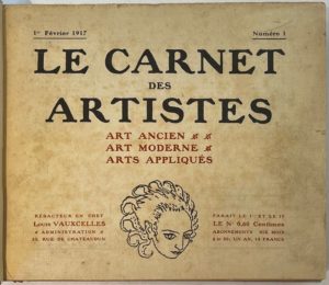 LE CARNET DES ARTISTES Art ancien, Art moderne, Arts appliqués N° 1, 1er février 1917-n° 21, 1er décembre 1917. Paris, Rédacteur en chef : Louis Vauxcelles. Textes de George Auriol, Joseph Billiet, Jacques-Émile Blanche, Sylvestre Bonnard, Francis Carco, Gustave Coquiot, Théodore Duret, André Fontainas, Max Goth, Maurice Guillemot, Louise Hervieu, F. Jean-Desthieux, Frantz Jourdain, Octave Mirbeau, Michel Puy, André Salmon, Louis Vauxcelles, Charles Vildrac, etc. Nombreuses illustrations. Collection complète. 21 numéros en 21 livraisons en 1 vol. in-8 à l’italienne relié (couvertures conservées).