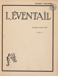 L’ÉVENTAIL Revue de littérature et d’art paraissant à Genève Numéro spécimen, 15 octobre 1917 ; 1ère année : n° 1, 15 novembre 1917-n° 12, 15 décembre 1918 ; 2e année : n° 1, 15 janvier 1919-n° 10, 15 novembre 1919. Le n° spécimen comporte des fragments d’articles (qui ne sont pas exactement les mêmes que ceux du vrai n° 1), des illustrations h.-t. (qui n’existent pas dans le n° 1) et des pages blanches. Le n° 4 est en double. Le n° 10, dernier numéro de L’Éventail, est tiré sur épreuves pour Paul Lombard et comporte les hommages dévoués de François Laya. Genève, Directeur : François Laya, Secrétaire de rédaction : René-Louis Piachaud, puis Georges Hoffmann. Textes de Guillaume Apollinaire, Louis Aragon, André Breton, Francis Carco, Jean Cassou, Louis Chadourne, Alexandre Cingria, Édouard Dujardin, Paul Fort, André Gide, Max Jacob, Edmond Jaloux, François Laya, Stéphane Mallarmé (Vers inédits), Francis de Miomandre, Conrad Moricand, Rachilde, Henri de Régnier, Pierre Reverdy, Jacques Rivière, Jules Romains, André Rouveyre, André Salmon, Philippe Soupault, Henry Spiess, André Spire, Paul-Jean Toulet, Francis Vielé-Griffin, Walt Whitman, Willy, etc. Illustrations et reproductions de Félix Appenzeller, Maurice Barraud, Alexandre Blanchet, Émile Bressler, Paul Cézanne, Alexandre Cingria, Camille Corot, Honoré Daumier, Edgar Degas, Paul Gauguin, Édouard Manet, Claude Monet, Auguste Renoir, Auguste Rodin, André Rouveyre, Alfred Sisley, Ossip Zadkine, etc. Collection complète. 22 livraisons en 2 vol. in-8 carré reliés sous emboîtage + 2 vol. brochés. Notes manuscrites de Vasseur (9 ff.). Joint : Au Tome I : – 1 L.A.S. de Louis Aragon à François Laya, s.d. [1918] ; – 1 L.A.S. d’André Breton à François Laya (30 septembre 1918), dans laquelle il évoque Apollinaire et son portrait gravé sur bois par Chirico et lui propose une étude sur Alfred Jarry ; – 1 L.A.S. de Hubert Sangnier à André Vasseur (26 novembre 1961) ; – 1 portrait de Paul-Jean Toulet par S. de Clausade ; – 1 portrait d’André Gide par S. Genfkon [ ?], num. (64 / 75) et signé ; – 1 coupure de presse du Journal de Genève (« L’éventail » par P.O. Walzer, octobre 1969), Au Tome II : – 1 L.A.S. de M. de Buzelet à André Vasseur (juin 1964). Rarissime avec le n° spécimen d’octobre 1917 et le n° 10 de novembre 1919, tiré sur épreuves.