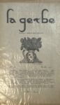 LA GERBE Revue Mensuelle : Art, Sciences, Littérature, Philosophie, Commerce, Industrie N° 1, octobre 1918-n° 32, mai 1921. Il manque le n° 27 (décembre 1920). Nantes, Directeur : Albert Gavy-Bélédin. Textes de René Arcos, Claude Cahun, Jeanne Destranges, Daniel Douglas, René Druart, Georges Duhamel, André Fontainas, Paul Fort, Albert Gavy-Bélédin, A.-Ferdinand Herold, Louise Hervieu, René Maublanc, Morin-Jean, Jules Romains, André Salmon, René Schwob, Émile Verhaeren, Charles Vildrac, Louis J. Villa, etc. Illustrations de P.-E. Colin, Paul Deltombe, Marcel Gromaire, Louise Hervieu, Jehan Humbert, J.-E. Laboureur, Frans Masereel, Morin-Jean, Ottmann, Paul Signac, etc. 31 numéros en 31 livraisons in-8 brochées sous emboîtages. Joint : – 1 L.D.S (juin 1966) de la Bibliothèque municipale de Nantes ; – 1 L.A.S. de M. Bélédin (fils) (1966) ; – 1 L.A.S. de M. Albert Gavy-Bélédin (ancien directeur de La Gerbe) (juillet 1966). Toutes ces lettres sont relatives à La Gerbe (celle de M. Albert Gavy-Bélédin donne à A. Vasseur le sommaire du n° 27).