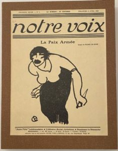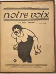 NOTRE VOIX Hebdomadaire littéraire, social, artistique, paraissant le dimanche N° 1, dimanche 6 avril 1919-n° 28, dimanche 12 octobre 1919. Gérant : Camille Delong. Textes de René Arcos, Henri Barbusse, André Bataille, Georges Chennevières, Pierre Jean Jouve, Florian Parmentier, Georges Pioch, Joseph Rivière, Romain Rolland, Han Ryner, Marcel Sauvage, André Spire, Charles Vildrac, Léon Werth, etc. Illustrations de J. Aurélian, Gabriel Belot, F.-M. Berthet, Bour, Dino, Jules Kaufman, Lucien Laforge, Pierre Larivière, Picart Le Doux. 28 numéros en 28 livraisons in-4 sous emboîtage. Notes manuscrites de Vasseur (2 ff.).