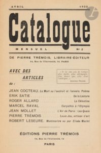 CATALOGUE MENSUEL DE PIERRE TRÉMOIS N° 1, mars 1922-n° 6, novembre 1922. Paris. Éditions Pierre Trémois. Textes de Roger Allard, Guillaume Apollinaire, Georges Auric, Caryathis, Maurice Chevrier, Jean Cocteau, Jean Epstein, Georges Gabory, Claude Hariel, Robert Leseure, W. Mayr, Jean Mollet, Francis Poulenc, Raymond Radiguet, Marcel Raval, Henri-Pierre Roché, Erik Satie, Edge Trémois, Pierre Trémois. Collection complète. 6 numéros en 6 livraisons in-8 brochées sous emboîtage. Pierre Trémois, libraire-éditeur, fit paraître des catalogues de 16 pages, dont la moitié était réservée à des textes d’écrivains connus avec quelquefois un dessin inédit (comme par exemple 1 dessin original en pleine page de Marie Laurencin et 1 dessin inédit, en double page, de Dunoyer de Segonzac).