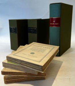 LE DISQUE VERT Revue mensuelle de littérature 1ère année, 1ère série : n° 1, mai 1922-n° 6, octobre 1922 ; 1ère année, 2e série, sous le titre Écrits du Nord : n° 1, novembre 1922-n° 3, janvier 1923 ; à nouveau sous le titre Le Disque Vert : n° 4 / 5 / 6, février-mars-avril 1923 ; 2e année : n° 1, octobre 1923-n° 3, décembre 1923 ; 2e année, 3e série : n° 4-5, 1924 (consacré à Charlot) + n° spécial « Freud et la psychanalyse », juin 1924 ; 3e année, 4e série : n° 1, 1925-n° 3, 1925 + n° spécial « Le cas Lautréamont », 1925 ; Nouvelle série : 1ère année : n° 1, avril 1953-n° 4, novembre / décembre 1953 ; Nouvelle série : 2e année : n° 5 janvier / février 1954-n° 6, mars / avril 1954 + « Hommage à Marcel Proust », Hors-série, décembre 1952 + « C.G. Jung », 1955. Paris-Bruxelles, Directeur : Franz Hellens, Comité de rédaction : En France : André Salmon, Jean Paulhan, En Belgique : Franz Hellens, Max Jacob, Mélot du Dy, Odilon-Jean Périer, Paul Fierens, Robert Goffin. Textes de René Alleau, Marcel Arland, Antonin Artaud, Gabriel Audisio, Corpus Barga, Samuel Beckett, Maurice Blanchard, André Breton, Claude Cahun, Jean Cassou, Blaise Cendrars, Charlie Chaplin, Jean Cocteau, Benjamin Crémieux, René Crevel, René Daumal, Joseph Delteil, Paul Dermée, Robert Desnos, Fernand Divoire, Édouard Dujardin, Paul Éluard, Serge Essenine, Étiemble, Florent Fels, Paul Fierens, André Gide, Camille Goemans, Robert Goffin, Ramón Gómez de la Serna, Robert Guiette, Éric de Haulleville, Franz Hellens, Henri Hertz, Marcel Jouhandeau, Léon Kochnitzky, Georges Lambrichs, Valery Larbaud, Marcel Lecomte, Michel Leiris, André Lhote, Pierre Mac Orlan, André Malraux, Mélot du Dy, René Micha, Henry Michaux, Jean Paulhan, Benjamin Péret, Odilon-Jean Périer, Pascal Pia, Léon Pierre-Quint, André Pieyre de Mandiargues, Georges Pillement, Francis Ponge, Henri Pourrat, René Purnal, Raymond Radiguet, C.-F. Ramuz, Pierre Reverdy, Georges Ribemont-Dessaignes, Jules Romains, André Salmon, Marcel Sauvage, Pierre Sichel, René de Solier, Philippe Soupault, Jules Supervielle, Henri Thomas, Paul Valéry, Henri Vandeputte, Alexandre Vialatte… 13 livraisons en 1 vol. in-4 relié, 12 livraisons in-12 brochés sous 2 emboîtages et 4 vol. in-8 brochés. De mai 1922 à décembre 1923, la collection est sur papier de luxe (13 livraisons, n° 35, ex. de James Ensor, 3 fascicules portant sa signature au second plat de couverture). Joint : Au vol. relié : – 1 L.A.S. de Franz Hellens à [Édouard Dujardin] sur papier à en-tête du Disque Vert (19 octobre 1922) dans laquelle il est dit : « À partir du 1er novembre Le Disque Vert prendra le titre des Écrits du Nord… » ; – 1 L.A.S. du libraire Paul van der Perre à André Vasseur (20 avril 1962) dans laquelle il est question du présent exemplaire. Ouvrages joints : – Au Disque Vert, (Paris-Bruxelles, 1934) ; – Le Dernier Disque Vert, Hommage à Franz Hellens (Paris, Éditions Albin Michel, 1957).
