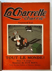 La CHARETTE « CHARRIE » AUJOURD’HUI N° 1, jeudi 15 juin 1922-n° 24, s.d. [1923]. Le n° 23 n’existe pas, il n’a pas paru. Paris, Rédacteur en chef : Paul Reboux. Textes de Henri Béraud, Colette, Curnonsky, Maurice Dekobra, Luis Delluc, Roland Dorgelès, Henri Duvernois, Franc-Nohain, Jean Galtier-Boissière, Michel Georges-Michel, Michel Herbert, Charles-Henri Hirsch, Henri Jeanson, Pierre Mac-Orlan, Francis de Miomandre, Paul Reboux, Séverine, Fernand Vandérem, Pierre Veber, Émile Vuillermoz, André Warnod, etc. Illustrations de Bécan, Gus Bofa, Boris, Abel Faivre, Pierre Falké, R. Guérin, Joseph Hémard, Lucien Laforge, Jean Oberlé, Pavis, Roubille, Sem, etc. Collection complète. 23 numéros en 23 livraisons en 1 vol. in-folio relié. Tous les numéros de la présente collection sont sur pur fil Lafuma (tirage à 50 ex.). Il est joint les n° 4 et 17 sur papier d’édition. Notes manuscrites de Vasseur (2 ff.).